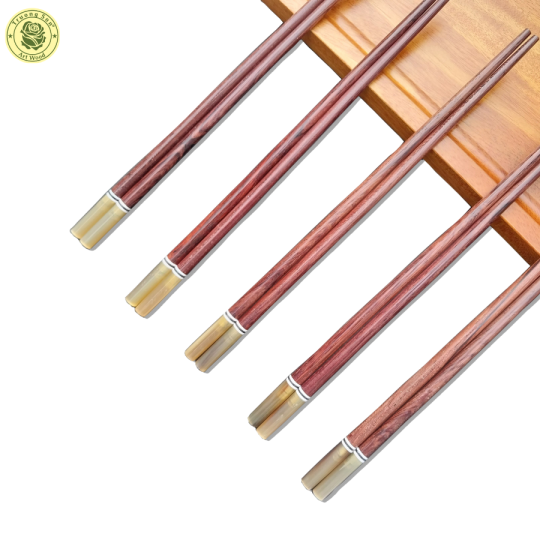 Sắc đũa tối trầm ánh đỏ, cộng thêm vân gỗ điểm nhẹ nâu, trắng đan xen như gợn nước. Sự kết hợp giữa gỗ cẩm lai và sừng tạo nên vẻ đẹp sang trọng và độc đáo, xứng đáng xuất hiện trong không gian bếp của bạn.